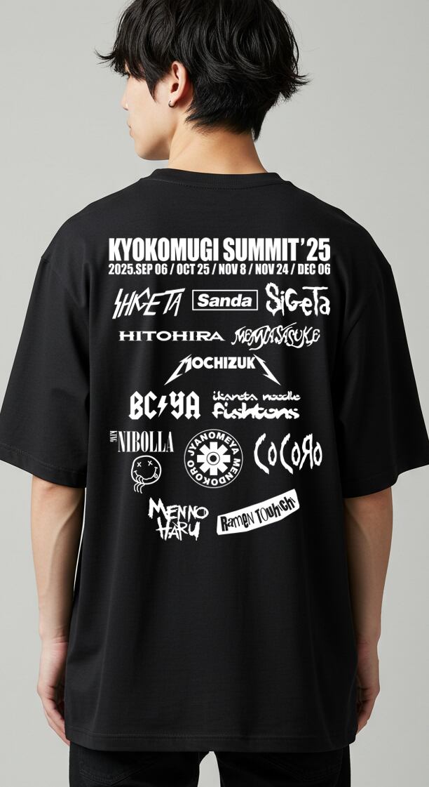 「KYOKOMUGI SUMMIT 2025」は、京小麦サミット2025のオフィシャルTシャツです!京小麦サミット2025に参加する店舗のロゴをバンド風ロゴにオマージュ。フェスのTシャツ風に仕上げました。